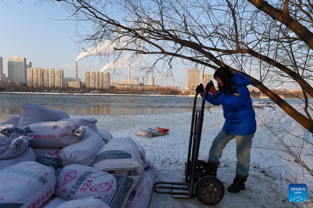 Wang Tingting transfers bird food on Changbai Island in Jilin City, northeast China's Jilin Province, Jan. 28, 2026. Wang Tingting, a post-90s bird protector, stays every day at Changbai Island wetland park, a bird paradise seated by the Songhua River in Jilin City, to care for the birds--providing food and observing their living conditions.