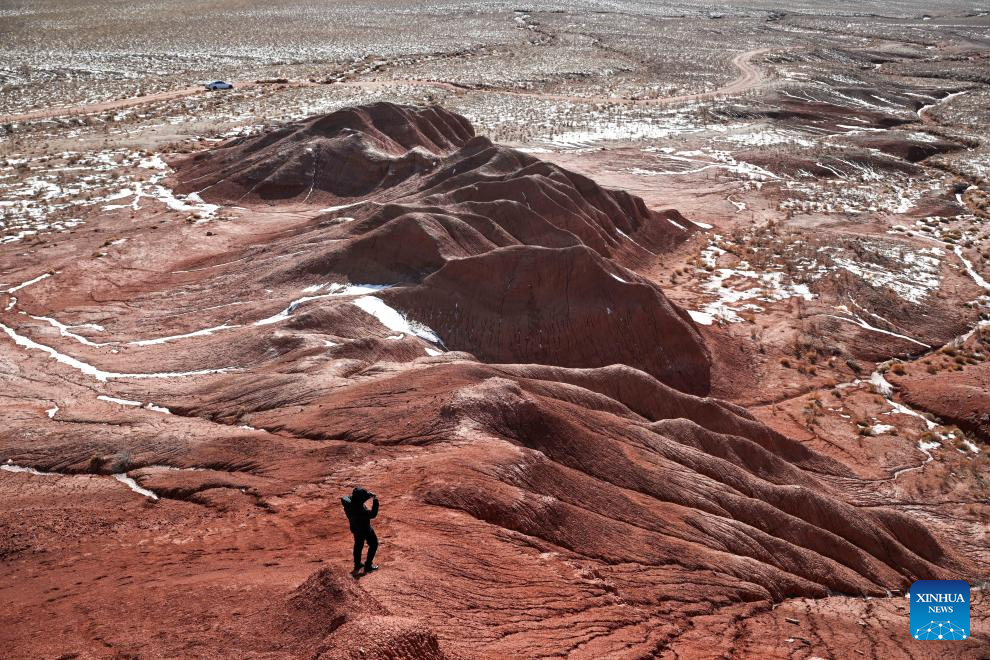 A tourist is seen at the Hongya Tableland in Siziwang Banner, north China's Inner Mongolia Autonomous Region on Jan. 29, 2026 Located in the northern part of Siziwang Banner in Ulanqab, the Hongya Tableland is a key component of the Siziwang National Geopark in north China's Inner Mongolia Autonomous Region. Featuring towering red hills and deep gullies, the landscape forms a majestic painting with lingering snow. (Xinhua/Bei He)