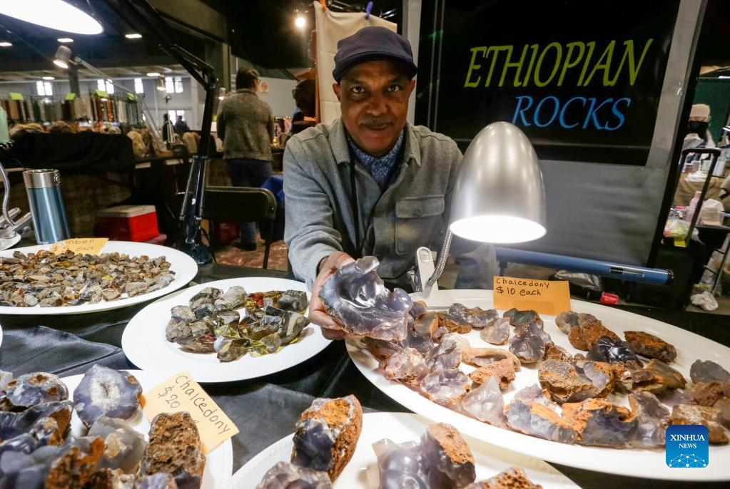 A vendor displays mineral rocks from Ethiopia during the Gem and Mineral Show in Vancouver, British Columbia, Canada, on March 25, 2022. The three-day show features about 100 vendors from across Canada with their gem, mineral and rare fossil collections. (Photo by Liang Sen/Xinhua)