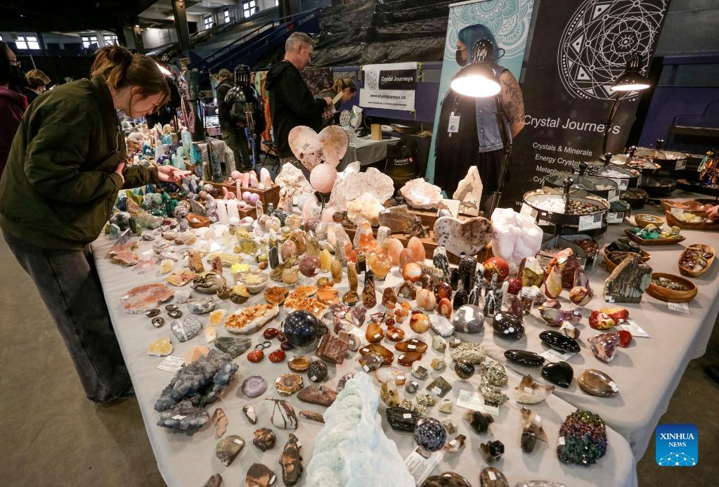Visitors look at gemstones displayed during the Gem and Mineral Show in Vancouver, British Columbia, Canada, on March 25, 2022. The three-day show features about 100 vendors from across Canada with their gem, mineral and rare fossil collections. (Photo by Liang Sen/Xinhua)