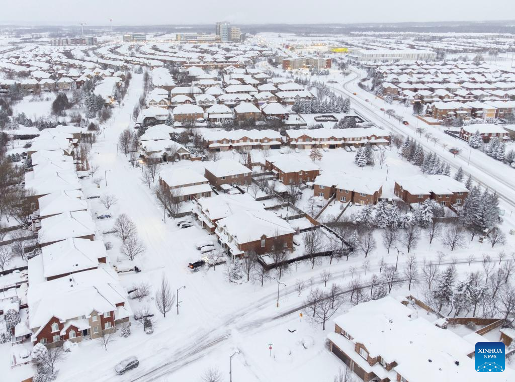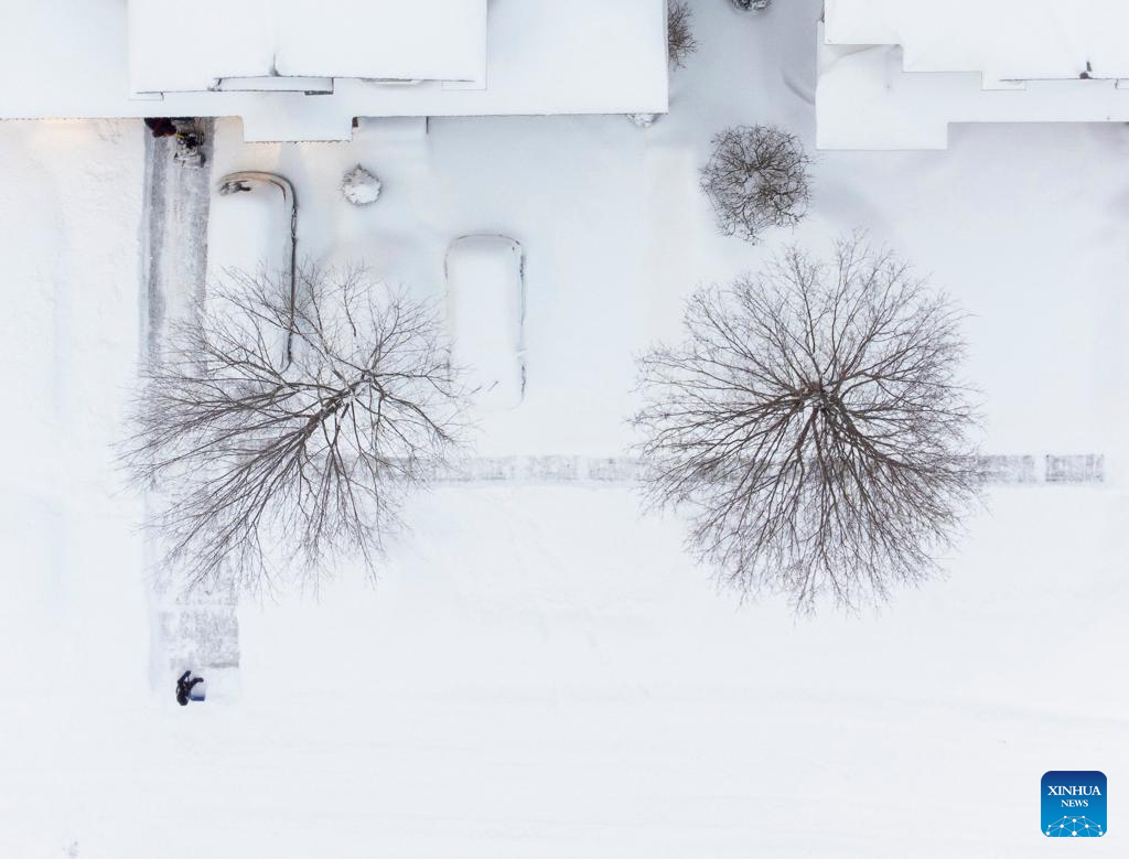 An aerial drone photo taken on Jan. 26, 2026 shows a snow-covered residential area in Oakville, the Greater Toronto Area, Canada. (Photo by Zou Zheng/Xinhua)