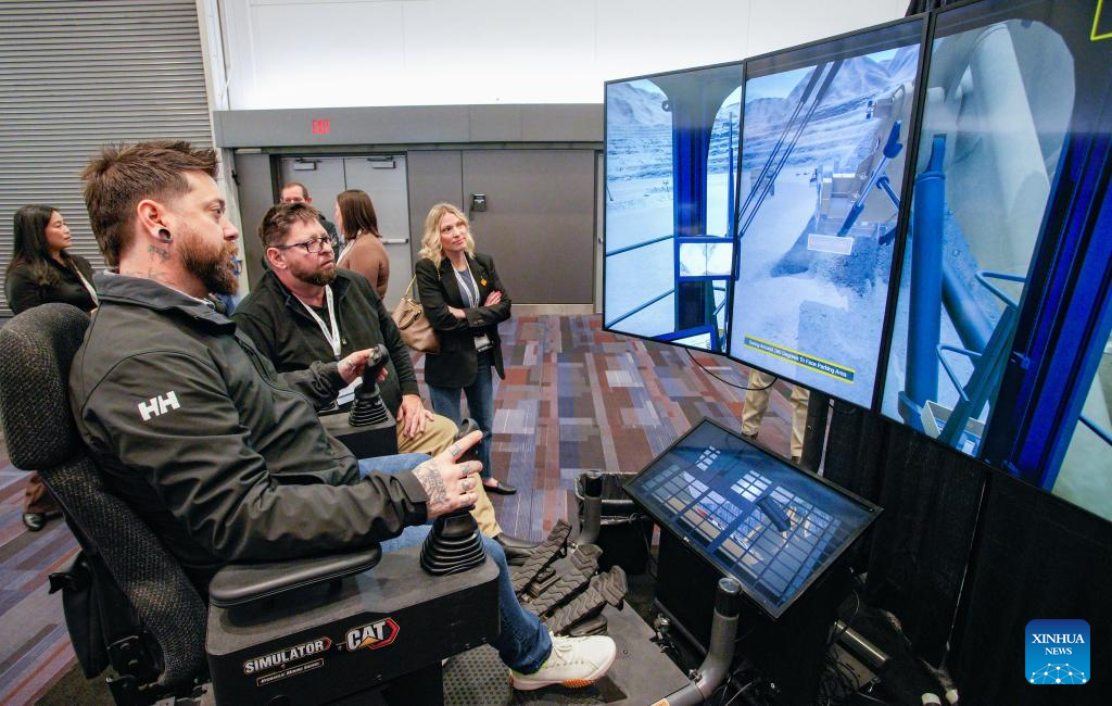 An attendee operates a mining training simulator during the Association for Mineral Exploration (AME) Roundup 2026 at the Vancouver Convention Centre in Vancouver, British Columbia, Canada, on Jan. 26, 2026. The AME Roundup 2026 kicked off here on Monday, featuring a four-day exhibition with exhibitors from around the world showcasing products, technologies and services related to mineral exploration and development. The event runs from Jan. 26 to Jan. 29. (Photo by Liang Sen/Xinhua)