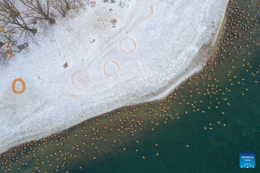 Birds inhabit the waters of Changbai Island in Jilin City, northeast China's Jilin Province, Jan. 28, 2026. Wang Tingting, a post-90s bird protector, stays every day at Changbai Island wetland park, a bird paradise seated by the Songhua River in Jilin City, to care for the birds--providing food and observing their living conditions.