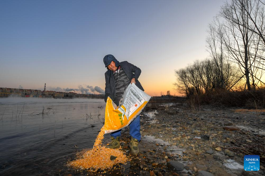 Ren Jianguo feeds birds on Changbai Island in Jilin City, northeast China's Jilin Province, Dec. 6, 2019. Wang Tingting, a post-90s bird protector, stays every day at Changbai Island wetland park, a bird paradise seated by the Songhua River in Jilin City, to care for the birds--providing food and observing their living conditions.