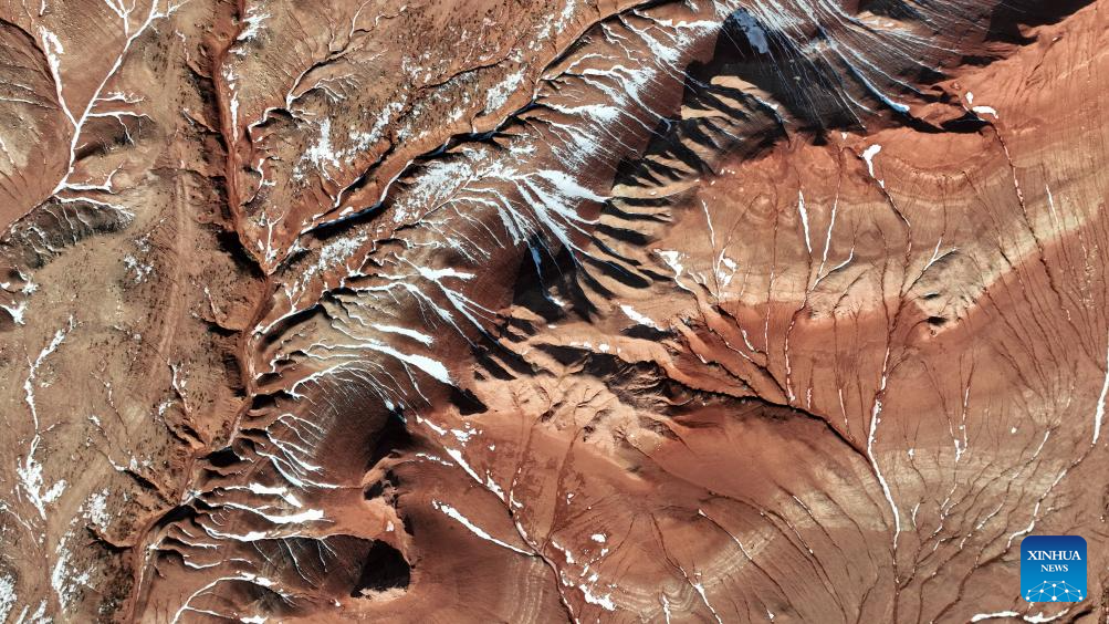 An aerial drone photo taken on Jan. 29, 2026 shows a scene of the Hongya Tableland in Siziwang Banner, north China's Inner Mongolia Autonomous Region. Located in the northern part of Siziwang Banner in Ulanqab, the Hongya Tableland is a key component of the Siziwang National Geopark in north China's Inner Mongolia Autonomous Region. Featuring towering red hills and deep gullies, the landscape forms a majestic painting with lingering snow. (Xinhua/Ma Jinrui)