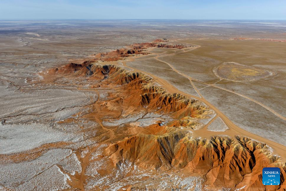An aerial drone photo taken on Jan. 29, 2026 shows a scene of the Hongya Tableland in Siziwang Banner, north China's Inner Mongolia Autonomous Region. Located in the northern part of Siziwang Banner in Ulanqab, the Hongya Tableland is a key component of the Siziwang National Geopark in north China's Inner Mongolia Autonomous Region. Featuring towering red hills and deep gullies, the landscape forms a majestic painting with lingering snow. (Xinhua/Bei He)