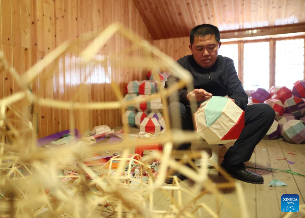 Dai Xin checks a finished Maolong (hairy dragon) latern at his residence in Shiqian County, southwest China's Guizhou Province, Jan. 27, 2026. (Xinhua/Liu Xu)