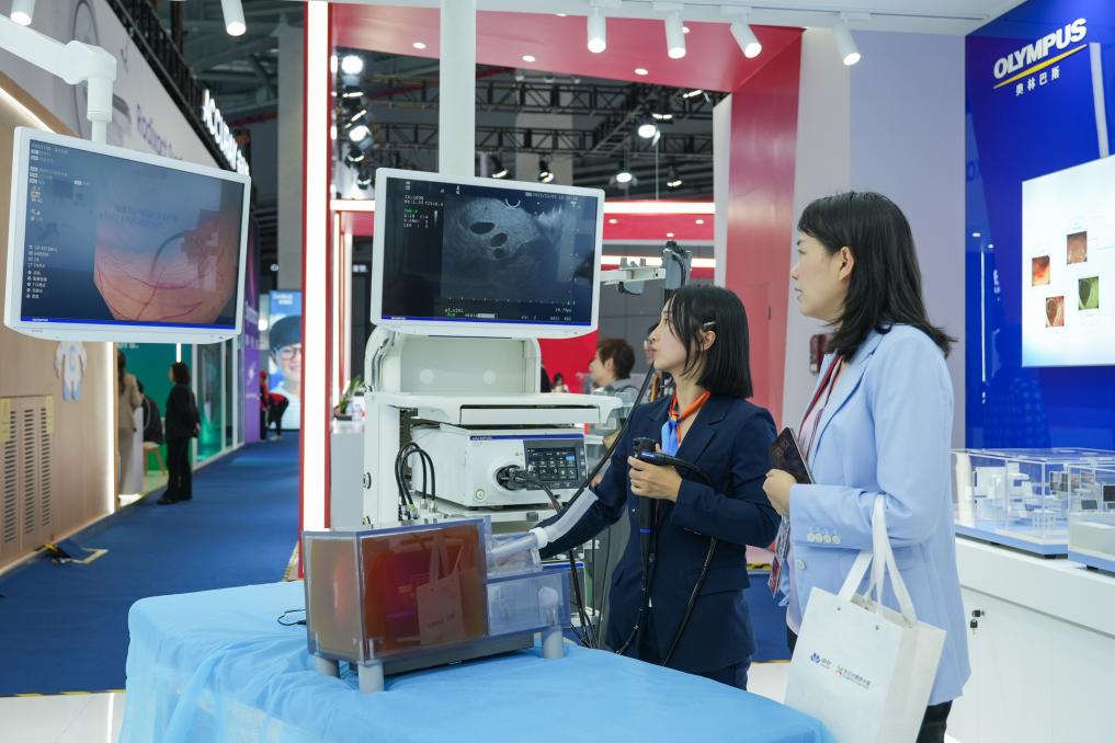 11月5日,在第八届进博会医疗器械及医药保健展区奥林巴斯展台,工作人员演示消化内镜系统。