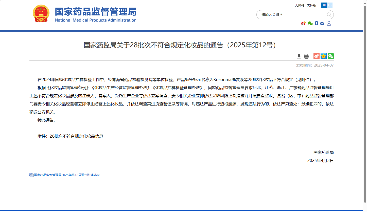國家藥監(jiān)局關(guān)于37批次不符合規(guī)定化妝品的通告(2025年第45號)
