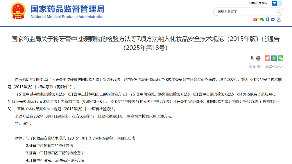 國家藥監(jiān)局關(guān)于將牙膏中過硬顆粒的檢驗方法等7項方法納入化妝品安全技術(shù)規(guī)范(2015年版)的通告(2025年第18號)