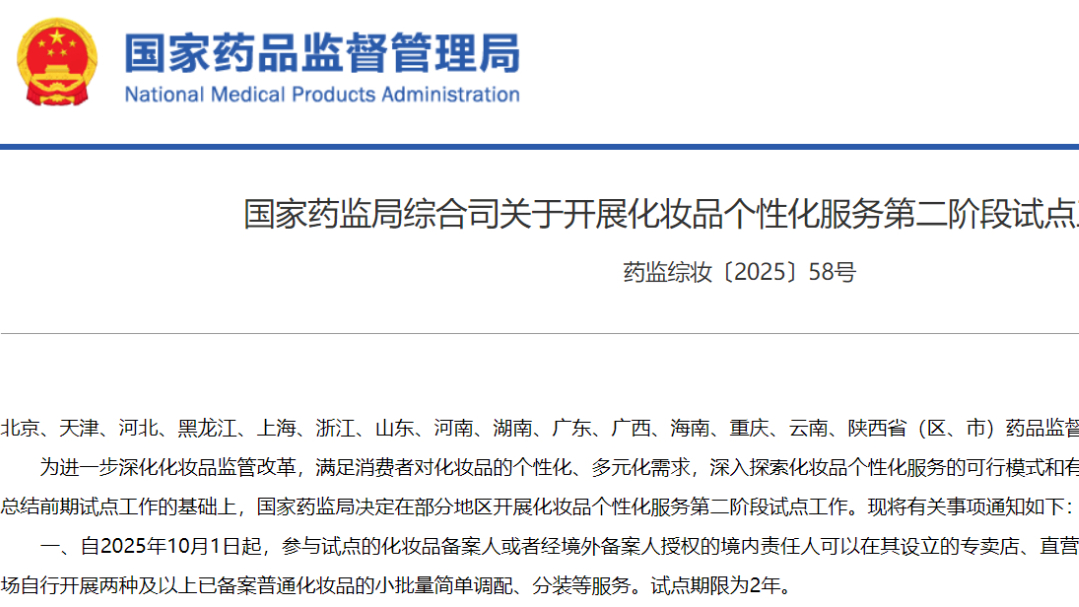 國家藥監(jiān)局綜合司關(guān)于開展化妝品個性化服務(wù)第二階段試點工作的通知 藥監(jiān)綜妝〔2025〕58號