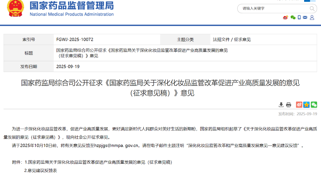 國家藥監(jiān)局綜合司公開征求《國家藥監(jiān)局關(guān)于深化化妝品監(jiān)管改革促進(jìn)產(chǎn)業(yè)高質(zhì)量發(fā)展的意見(征求意見稿)》意見