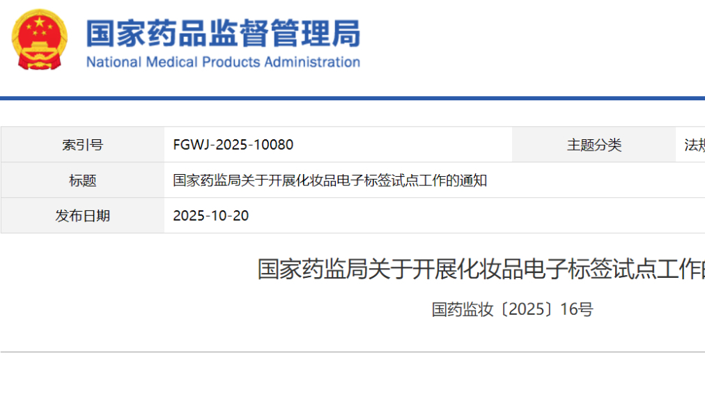 國家藥監(jiān)局關(guān)于開展化妝品電子標(biāo)簽試點工作的通知 國藥監(jiān)妝〔2025〕16號