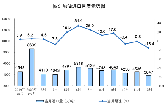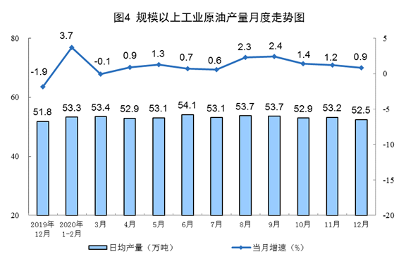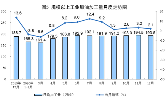 原油生產增速略有放緩。12月份,生產原油1627萬噸,同比增長0.9%,增速比上月回落0.3個百分點;日產52.5萬噸,環比減少0.7萬噸。加工原油6000萬噸,同比增長2.1%,比上月回落1.1個百分點。2020年,生產原油1.95億噸,比上年增長1.6%;加工原油6.7億噸,增長3.0%