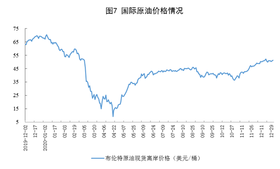 原油進口降幅擴大,國際原油價格繼續上漲。進口原油3847萬噸,環比減少689萬噸,同比下降15.4%,降幅比上月擴大14.6個百分點;2020年,進口原油5.4億噸,比上年增長7.3%1231日,布倫特原油現貨離岸價格為51.22美元/桶,比1130日的46.84美元/桶上漲9.4%