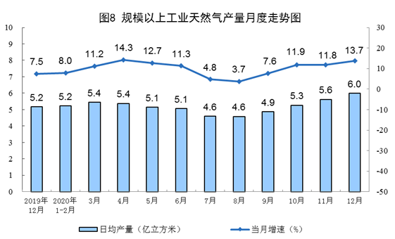 天然氣生產持續快速增長。12月份,生產天然氣187億立方米,同比增長13.7%,增速比上月加快1.9個百分點;日產6.0億立方米,環比增加0.4億立方米。2020年,生產天然氣1888億立方米,比上年增長9.8%,連續四年增產超過100億立方米。