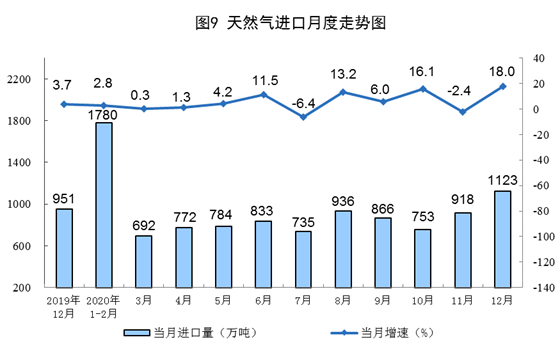 天然氣進口由降轉增。12月份,進口天然氣1123萬噸,同比增長18.0%,上月為下降2.4%2020年,進口天然氣1.02億噸,比上年增長5.3%