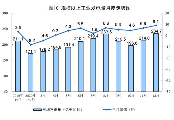 電力生產增速繼續加快。12月份,發電量7277億千瓦時,同比增長9.1%,增速比上月加快2.3個百分點;日均發電234.7億千瓦時,環比增加20.7億千瓦時。2020年,發電量74170億千瓦時,比上年增長2.7%