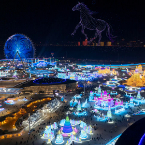 这是2026年1月5日拍摄的哈尔滨冰雪大世界园区的无人机表演(无人机照片)。新华社记者 张涛 摄