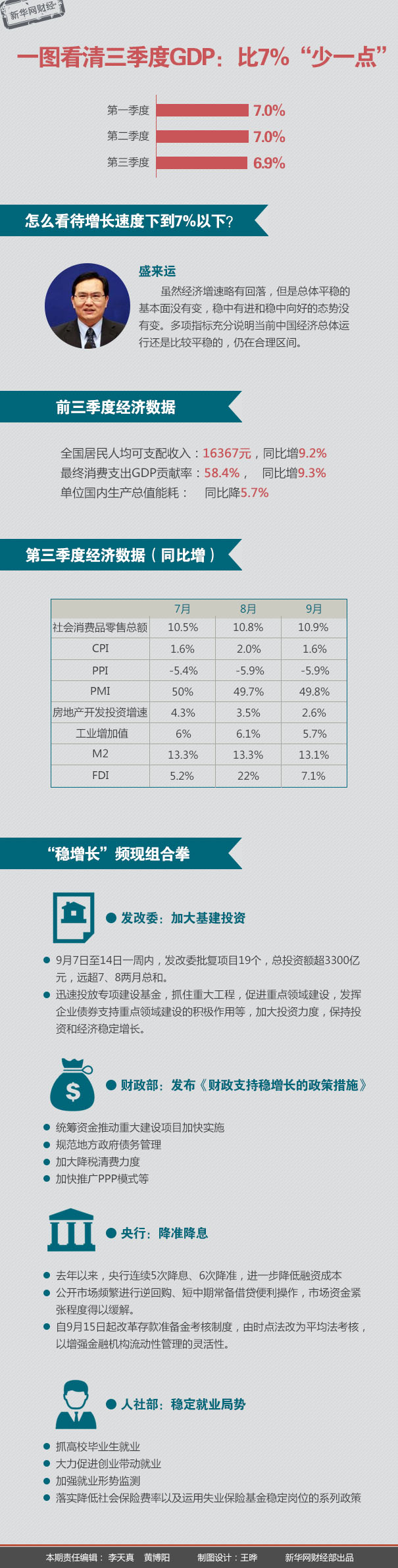 ????新華網(wǎng)北京10月19日電(記者 徐曼曼)備受關(guān)注的中國經(jīng)濟“三季報”今日揭開面紗。國家統(tǒng)計局數(shù)據(jù)顯示,三季度GDP同比增幅為6.9%,創(chuàng)下自2009年以來的最低增速,系官方首次以分季方式核算的GDP數(shù)據(jù)。初步核算,前三季度國內(nèi)生產(chǎn)總值487774億元,按可比價格計算,同比增長6.9%。