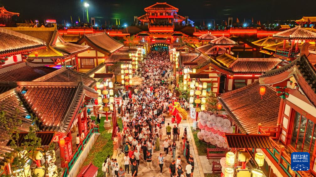 湖北省襄阳市唐城景区夜景璀璨,吸引游客前来游玩(无人机照片)。