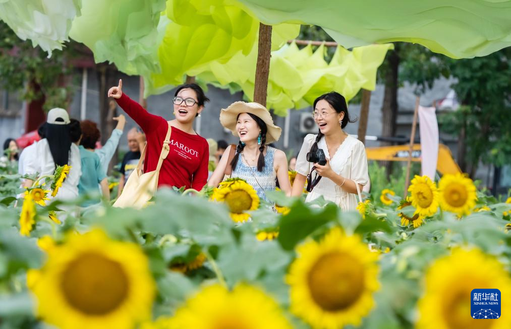 游客在河南省驻马店市西平县老王坡产业融合发展示范区的百亩油葵花海游玩。