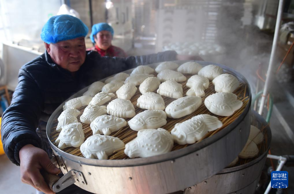 进入腊月,河北沧州部分乡村的面花作坊进入生产旺季,人们忙着制作各种形状的面花供应市场。面花是一种用模子塑形加工后蒸制的特色面食,有鱼、寿桃、十二生肖等造型,是当地春节期间的特色食品,经过揉面、搕花、晾花、蒸花等十多道工序制作而成。