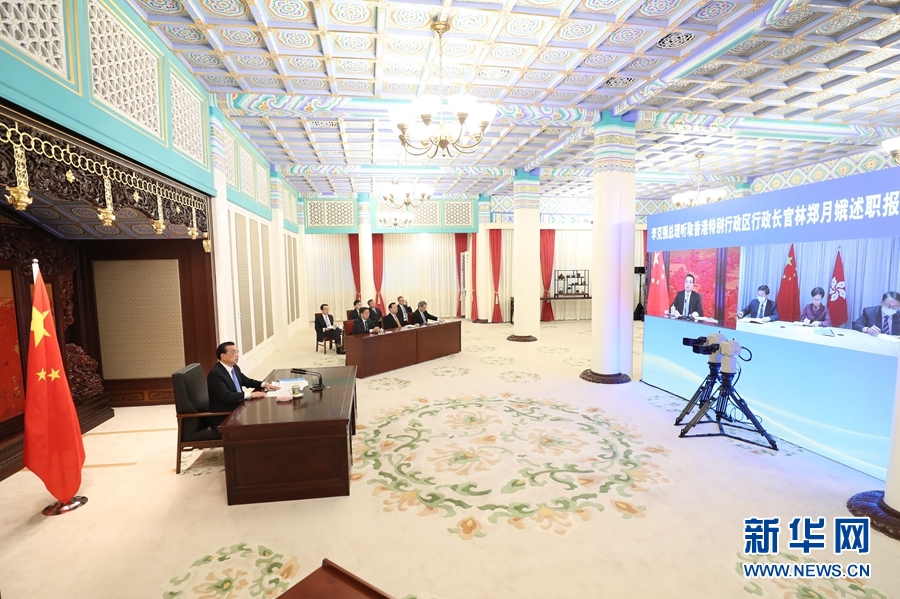 新華社北京1月27日電? 國務院總理李克強1月27日上午在中南海紫光閣以視頻連線方式聽取香港特別行政區行政長官林鄭月娥2020年度的述職報告。林鄭月娥匯報了香港特別行政區政府過去一年工作和新冠肺炎疫情防控等情況。