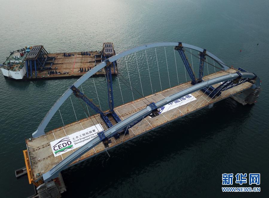 2月26日,從早晨7時開始,歷時5個小時,首次利用海潮漲落的“浮托法”,70多位現(xiàn)場施工人員經(jīng)過緊張調試,將內(nèi)地預制好的雙拱鋼橋精準對接并安裝在橋墩上。