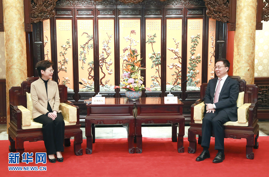 3月6日,中共中央政治局常委、國務院副總理韓正在北京釣魚臺國賓館會見香港特別行政區行政長官林鄭月娥。新華社記者 龐興雷 攝