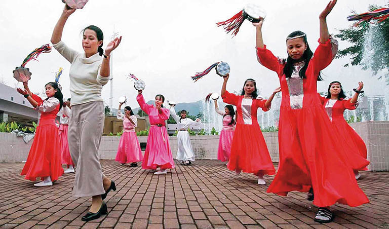 菲佣们在中国香港的郊野公园自娱自乐,跳起欢快的舞蹈