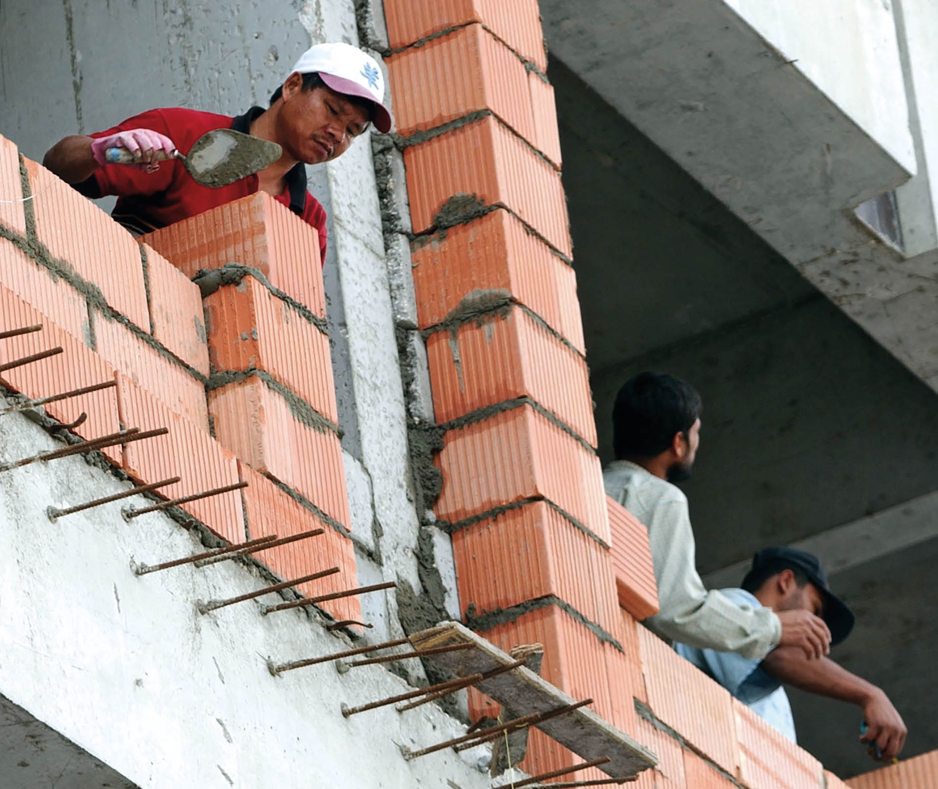 2003年3月26日,在卡塔尔首都多哈,一名菲律宾籍工人在一座在建楼房里砌墙