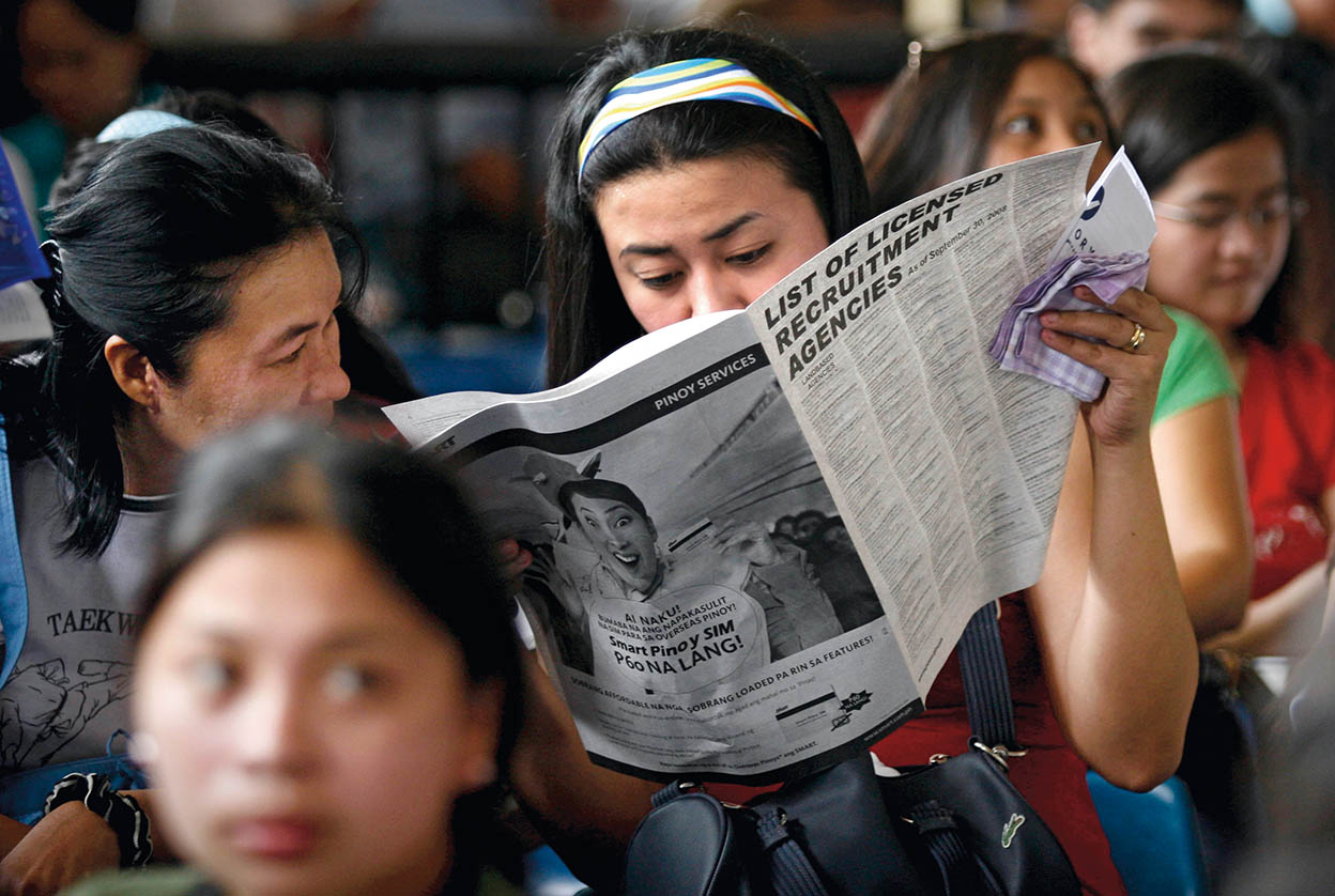 在菲律宾,这样的故事几乎天天发生。出国工作不仅是一种谋生方式,更被许多人视为一种“机会”。在马尼拉,不仅有大量专门介绍去海外务工的中介公司,大街小巷的墙壁、电线杆上也贴满了形形色色的广告:去中东做护士,去欧美当护工,去新加坡或中国香港做家政,甚至到邮轮和远洋货轮上工作。“高薪”“包食宿”“改变人生”等广告词,带着一种不容拒绝的诱惑。