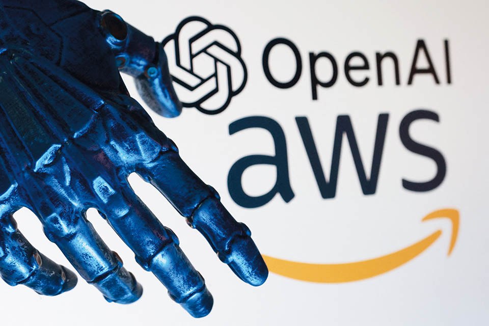 这是 2025 年 11 月 3日拍摄的美国亚马逊公司旗下的云计算服务平台(AWS)和 美国开放人工智能研究中心(OpenAI)标识。AWS与 OpenAI 3 日联合宣布,双方达成总额380亿美元、为期多年的战略合作协议