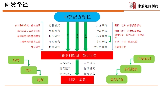 中藥配方顆粒的研制路線是從產(chǎn)品研制開始,要經(jīng)過標(biāo)準(zhǔn)復(fù)核、現(xiàn)場檢查、專家評審等環(huán)節(jié),最終需獲得藥監(jiān)管理部門的備案許可。研制路徑的重點(diǎn)主要是前期大量文獻(xiàn)的調(diào)研、過程中質(zhì)量控制的一致性研究和工藝的穩(wěn)定性、有效性再評價(jià)等,對企業(yè)的研發(fā)、人才及經(jīng)濟(jì)方面的投入要求非常高。