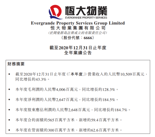數(shù)據(jù)顯示,2020年恒大物業(yè)實(shí)現(xiàn)營業(yè)收入105.09億元,同比增43.31%;毛利潤40.06億元,同比增128.26%;凈利潤26.47億元,同比增184.32%;現(xiàn)金余額126.04億元,同比增1742.69%;合約面積達(dá)5.65億平方米,同比增長11.88%;在管面積達(dá)3億平方米,同比增長26.05%。