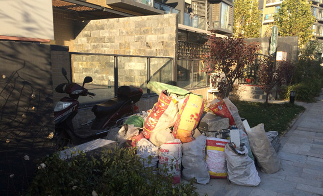在記者走訪的首開集團開發的項目中,最突出的問題是垃圾的處理。在走訪首開常青藤、首開知語城、首開國風上觀、首開石榴派時,記者在小區內部看到,建筑垃圾、裝修垃圾堆放數量多且時間長。業主普遍反映物業工作人員處理業主反映的問題并不積極。