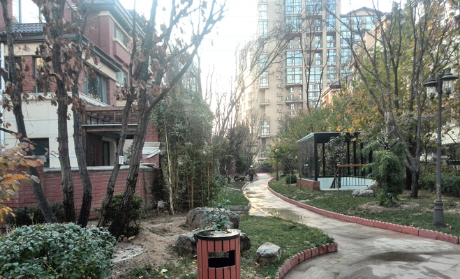 小區(qū)內(nèi)干凈、整潔,綠樹(shù)成蔭,但由于小區(qū)的體量較小,綠化、水系等景觀設(shè)計(jì)等均讓人感覺(jué)略顯局促。