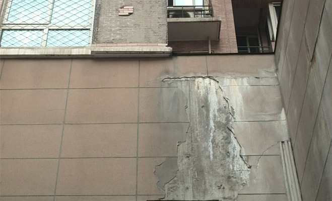 建筑質量問題是國瑞城回遷房業主們普遍抱怨的另一個重要問題。業主們說,有些樓棟存在墻體裂縫、墻皮脫落的情況,并有數次墻皮脫落時差點砸傷業主的情況。