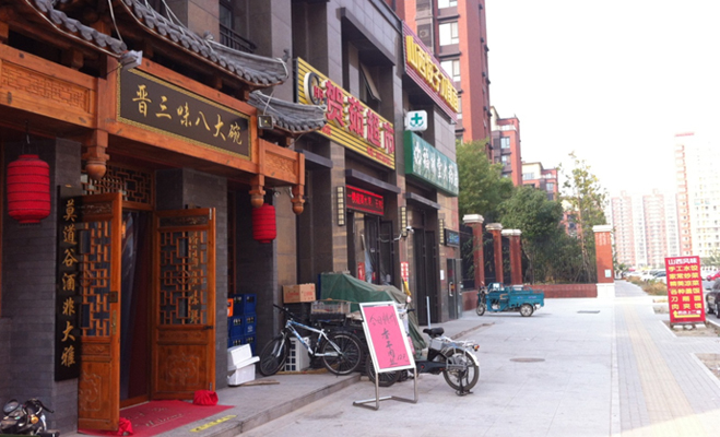 融創(chuàng)長灘壹號項目四周,記者步行10分鐘,繞道項目東側,看到晉三味八大碗飯店、小型超市以及福林堂大藥店,除此以外其余的生活配套,例如菜市場、洗衣店、自動提款機、寵物醫(yī)院、報刊亭等均需去景文屯村的下一站南百路才可以提供給業(yè)主使用。