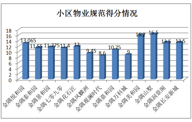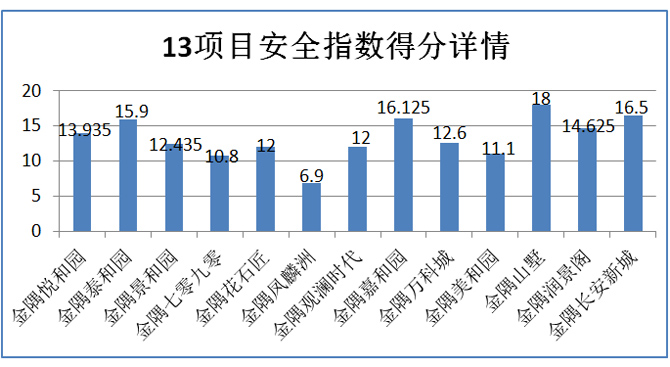 由上圖顯示,在目前的物業服務調查過程中,,有金隅項目得分最高,為28.5分,金隅觀瀾時代得分最低,為12分。
