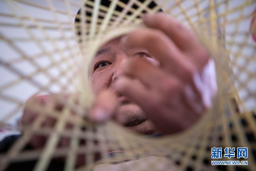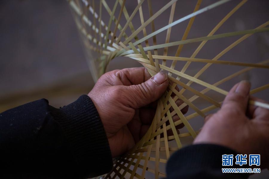 云南省會澤縣大一學(xué)生王淼的父親王玉榮在家中編竹編(2月6日)。新華社記者 林碧鋒 攝