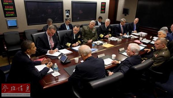??? 資料圖:2009年10月,美國總統奧巴馬在白宮時局值班室與美軍參謀長聯席會議成員及高級軍事顧問商討阿富汗作戰事宜。
