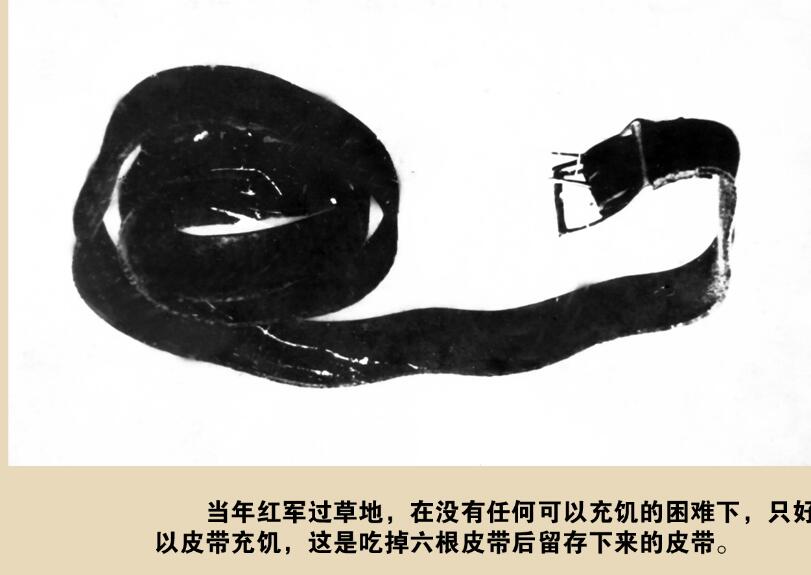 原來,這條皮帶是周廣才在1934年的一次戰(zhàn)斗中繳獲敵人的戰(zhàn)利品。但為了使全班戰(zhàn)友活下來,他只得含淚將皮帶拿出來。皮帶被切成幾段丟入滾燙的熱水中,煮熟后每人夾起“一截”狼吞虎咽的吃起來……當(dāng)鍋里還剩最后“一截”時他哭著說:“同志們,咱們留著它作個紀念吧,帶到延安去見毛主席。”懷著對革命勝利的無限渴望,最終他們把這截皮帶留了下來。