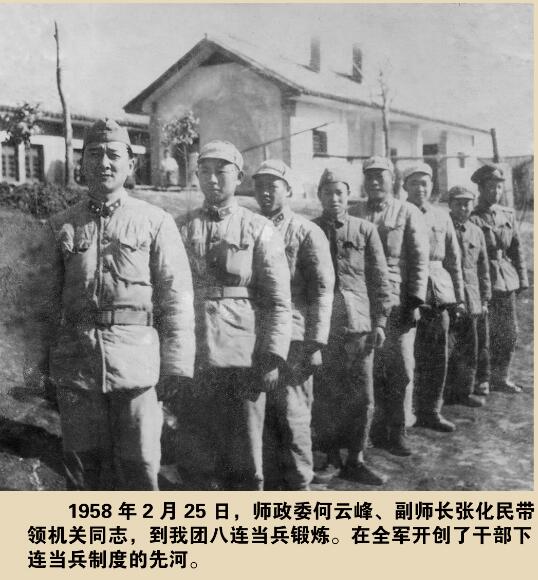 ????1958年8月,毛澤東主席在北戴河召開的中央政治局擴大會議上講話指出:“我們的軍官,像云南的一個師長,一年當一個月兵,我看這是好辦法?!@樣,我們的軍隊就是永遠打不散的軍隊。”毛主席口中的師長,實際是當時的師政委何云峰,而下連當兵的地方便在該團三營八連,八連也被譽為下連當兵第一連。