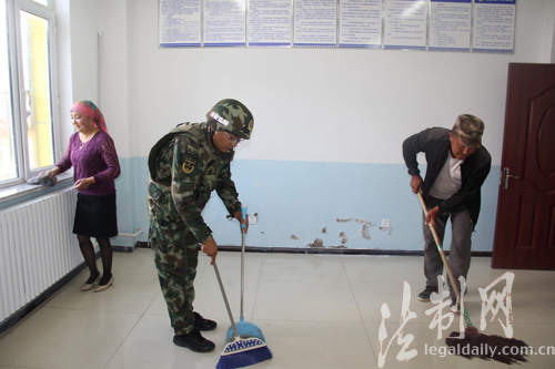 圖為“親戚”們在主動為官兵打掃警務室衛生