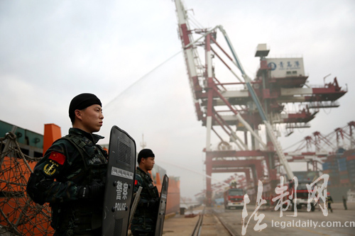 ????此次海上聯合反恐演練以阻止多名“涉恐分子”潛入港區及外輪企圖進行恐怖活動為背景,幾名“恐怖分子”駕車意圖混入油港區實施破壞,被識破后仍試圖強行進入。與此同時,前灣港集裝箱碼頭也發現幾名“涉恐分子”偽裝成船員,隨集裝箱貨輪進入港區實施破壞行動,并在一艘即將離港的貨輪上劫持“人質”,企圖逃離港區。面對如此復雜的局面,公安、邊檢、海關、國檢、港口等部門接到情報預警信息后,及時啟動海上聯合反恐處突應急預案,聯合反恐指揮部及時下達指令,參加演練單位立即行動,邊檢利劍突擊隊隊員迅速登輪控制“涉恐分子”,消防部門架設水槍撲滅引燃物品,海關、海事巡邏艇在集裝箱船舶周邊海域鋪設防油污圍欄,并收繳走私涉恐物資。成功處置險情后,碼頭恢復生產作業。