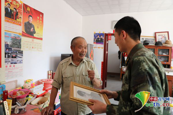 ????孟曉暉的爺爺孟慶欣也曾經(jīng)是一名解放軍戰(zhàn)士,并榮獲過(guò)獨(dú)立獎(jiǎng)?wù)隆C慨?dāng)說(shuō)起自己的從軍經(jīng)歷時(shí),這位年過(guò)八旬的老人都十分振奮,談到繼承了“紅色基因”的兒孫時(shí),孟慶欣老人的驕傲與自豪更是溢于言表。他說(shuō),自己經(jīng)常把當(dāng)年參軍的故事講給子孫聽(tīng),曉暉就是聽(tīng)著爺爺?shù)墓适麻L(zhǎng)大的,從小就說(shuō)自己長(zhǎng)大后也要當(dāng)兵。在唱起這首凝聚了他熱血青春與報(bào)國(guó)壯志的軍歌之前,老人嚴(yán)肅地說(shuō)道:“我要換上一身整潔的軍裝!”