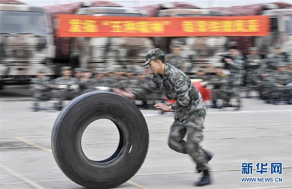 5月6日,沈陽聯勤保障中心某汽車運輸旅一營戰士在軍體比武上進行滾輪胎接力賽。新華社記者 許暢 攝