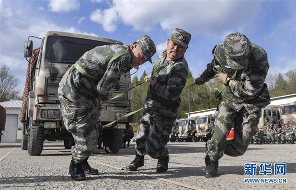 5月6日,沈陽聯勤保障中心某汽車運輸旅一營戰士在軍體比武上進行大力士拉車賽。新華社記者 許暢 攝